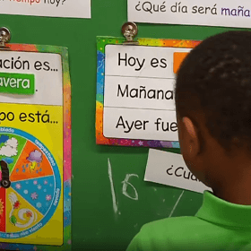 Language is learned best when children have a real reason to understand and use it. Immersion programs provide this context by teaching academic content through another language. Students aren't just learning Spanish or English; they are learning math or another subject that is taught in that language. Teachers make sure that the students can understand the meaning of what they are saying by using linguistic and non-linguistic strategies such as:
