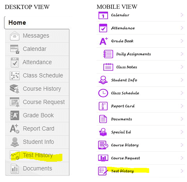 Families can access this information under the Test History tab (view examples of the desktop view option and mobile view option). If families would like more information or have questions concerning their student's score report, they can contact their student's school's STC for assistance.
